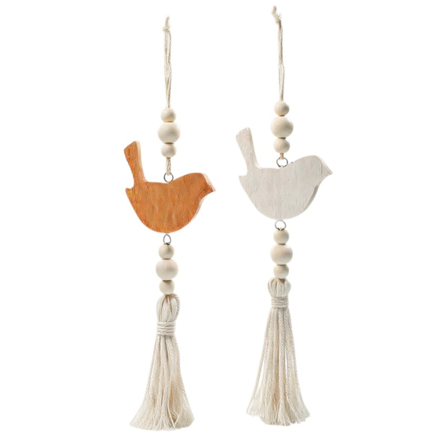 Die beiden Anhänger bestehen aus massivem Holz und sind in den Farben Orange und Weiß gestaltet. Ergänzt werden sie durch eine robuste Juteschnur sowie dekorative Holzperlen, die den Look harmonisch abrunden.