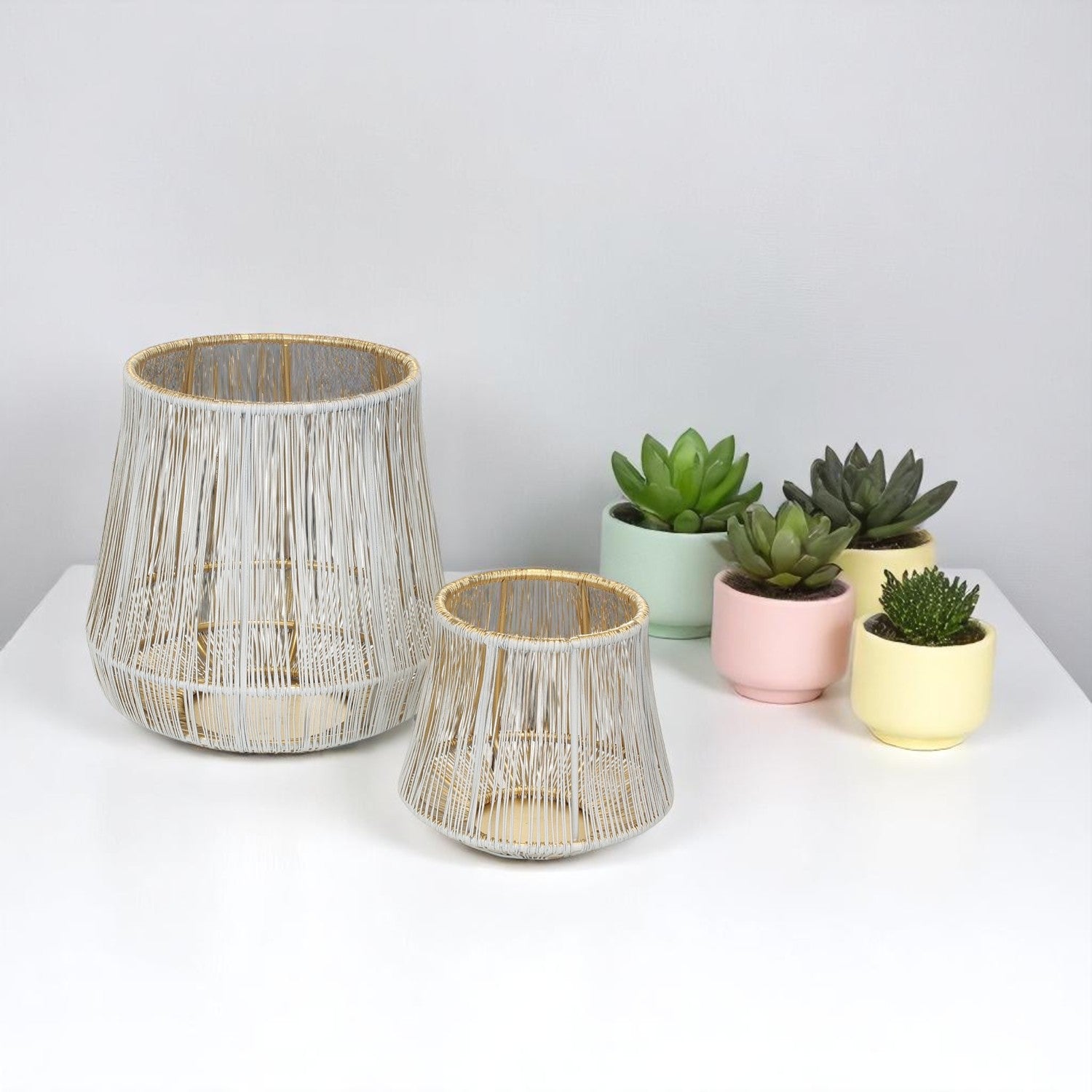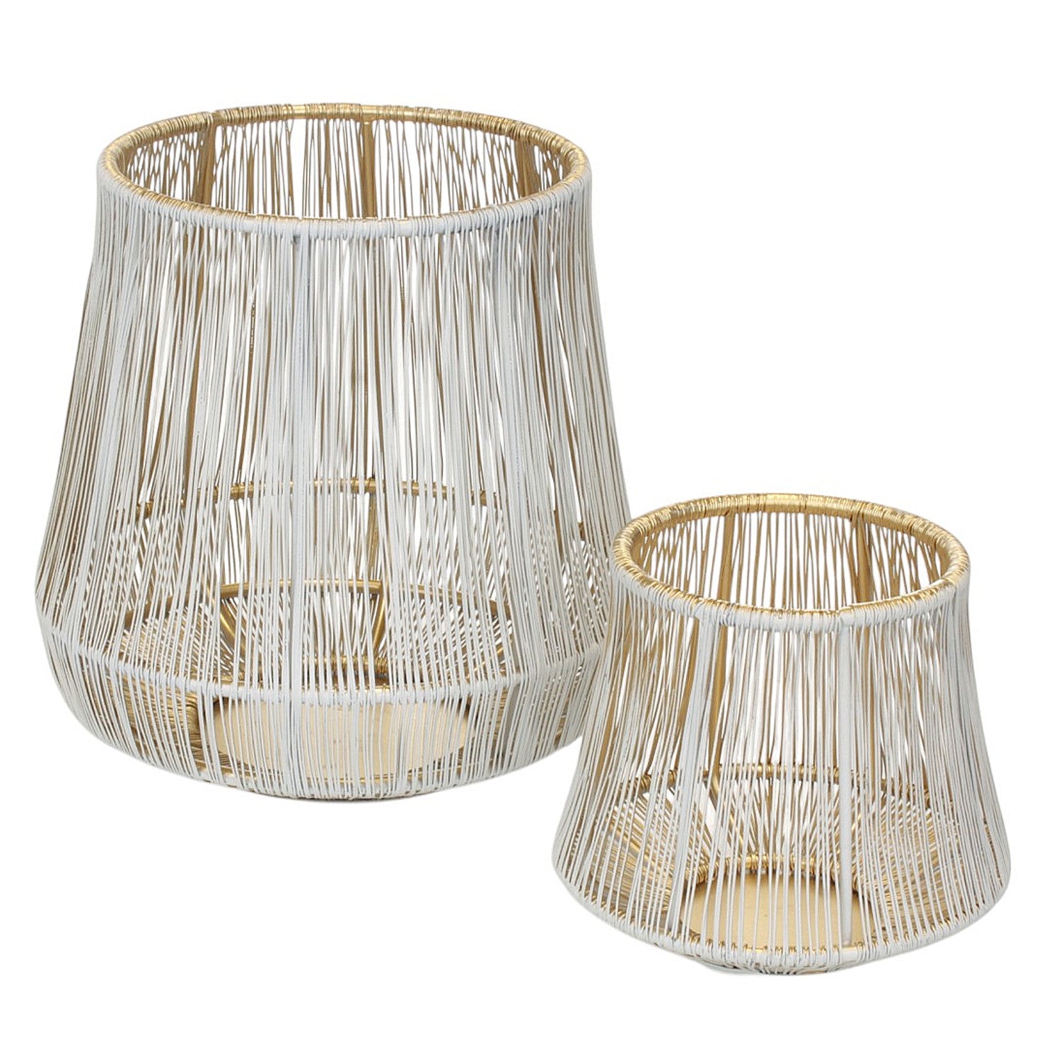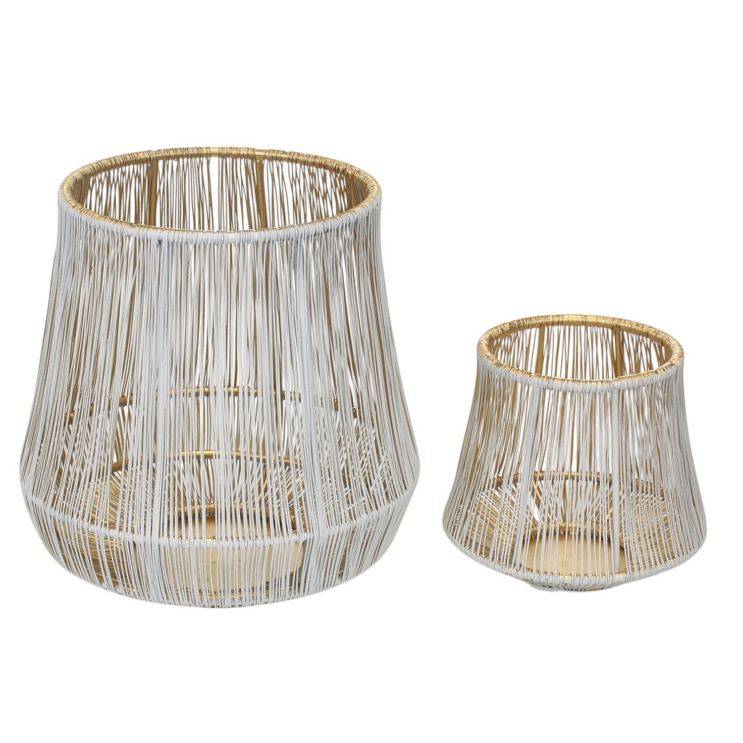 Das Set besteht aus zwei unterschiedlich großen Windlichtern (Größen: 7 x 7 x 10 cm und 11 x 11 x 15,5 cm), deren fein gespannte Metalldrähte wie zarte Linien wirken und ein modernes, luftiges Design ergeben.
