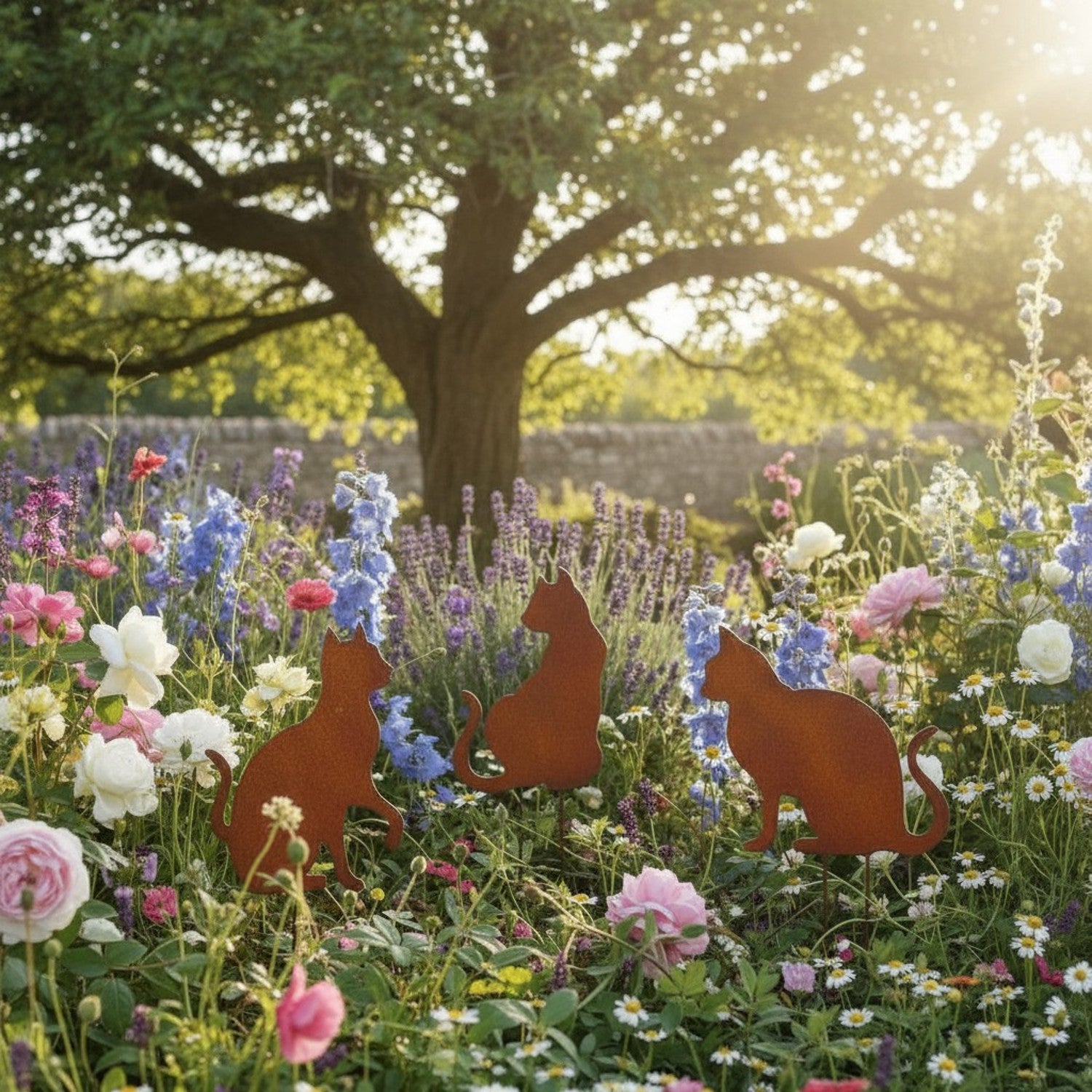 Die Motive zeigen sitzende Katzen in unterschiedlichen Haltungen und Größen, wodurch eine lebendige und ausgewogene Gartendekoration entsteht. Durch die Rostoptik fügen sich die Figuren harmonisch in Beete, Rasenflächen und Pflanzbereiche ein und wirken wie ein fester Bestandteil der Umgebung.