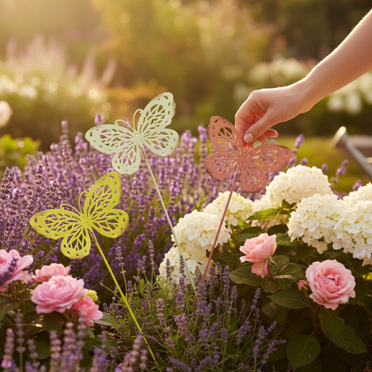 Dieses 4er Set Gartenstecker Schmetterlinge aus Metall bringt sofort Farbe und Struktur in Garten, Balkon, Hochbeet oder Blumentopf.