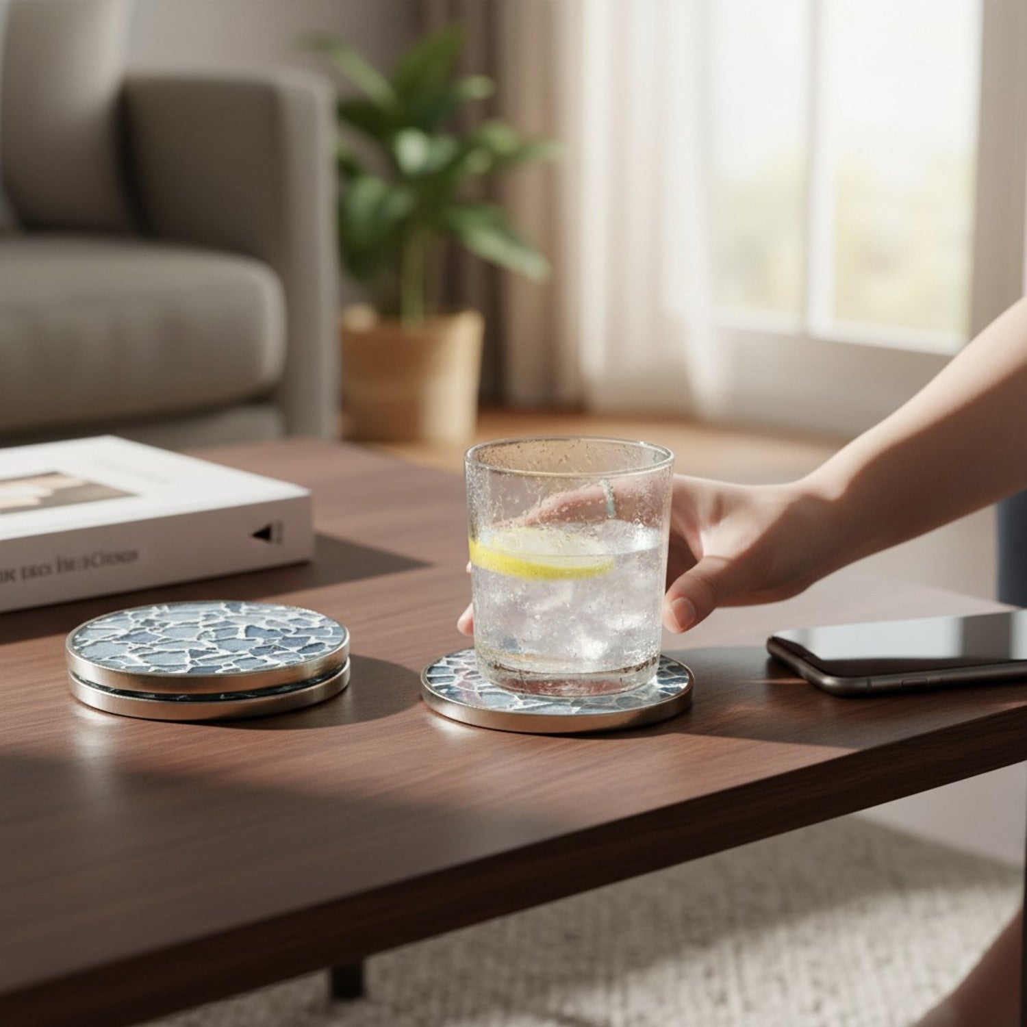 Die Untersetzer schützen Oberflächen zuverlässig vor Feuchtigkeit, Hitze und Glasrändern. Getränke können direkt abgestellt werden, ohne dass Wasserflecken oder Kratzer entstehen. Durch das feste Eigengewicht liegen sie sicher auf dem Tisch und verrutschen nicht leicht beim Abstellen oder Anheben von Gläsern.
