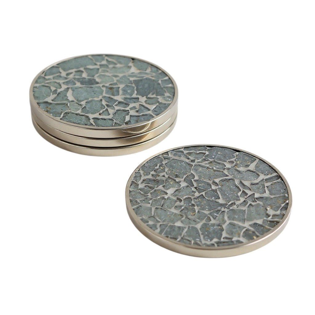 Die Untersetzer sind rund gearbeitet und haben einen Durchmesser von 10 cm sowie eine Höhe von 0,7 cm. Dadurch bieten sie ausreichend Platz für Gläser, Tassen, Becher oder kleine Karaffen. Die flache Bauweise sorgt dafür, dass sie nicht auftragen und sich unauffällig in jede Tischgestaltung einfügen. Die Metallumrandung verleiht Stabilität, schützt die Kanten und sorgt für eine saubere, wertige Optik.