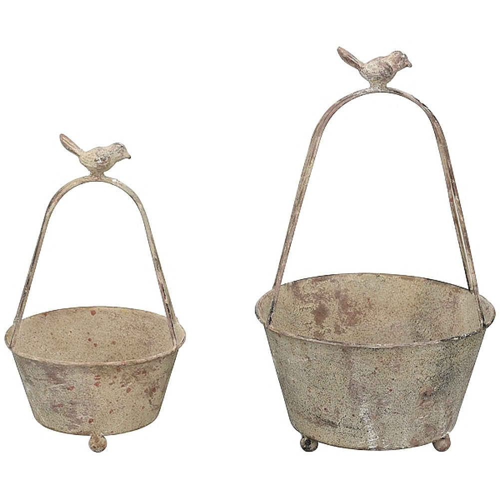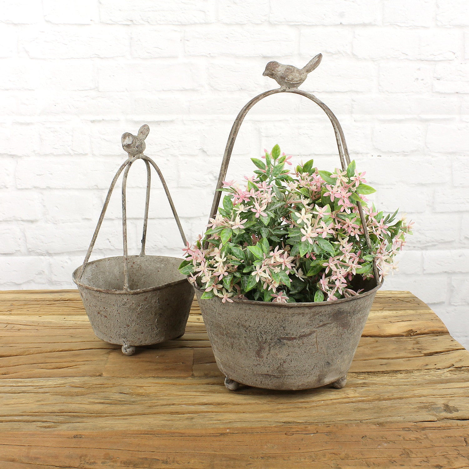 2er Set Deko Pflanztopf im Shabby Stil mit Rankhilfe auf welcher ein kleiner Vogel sitzt
