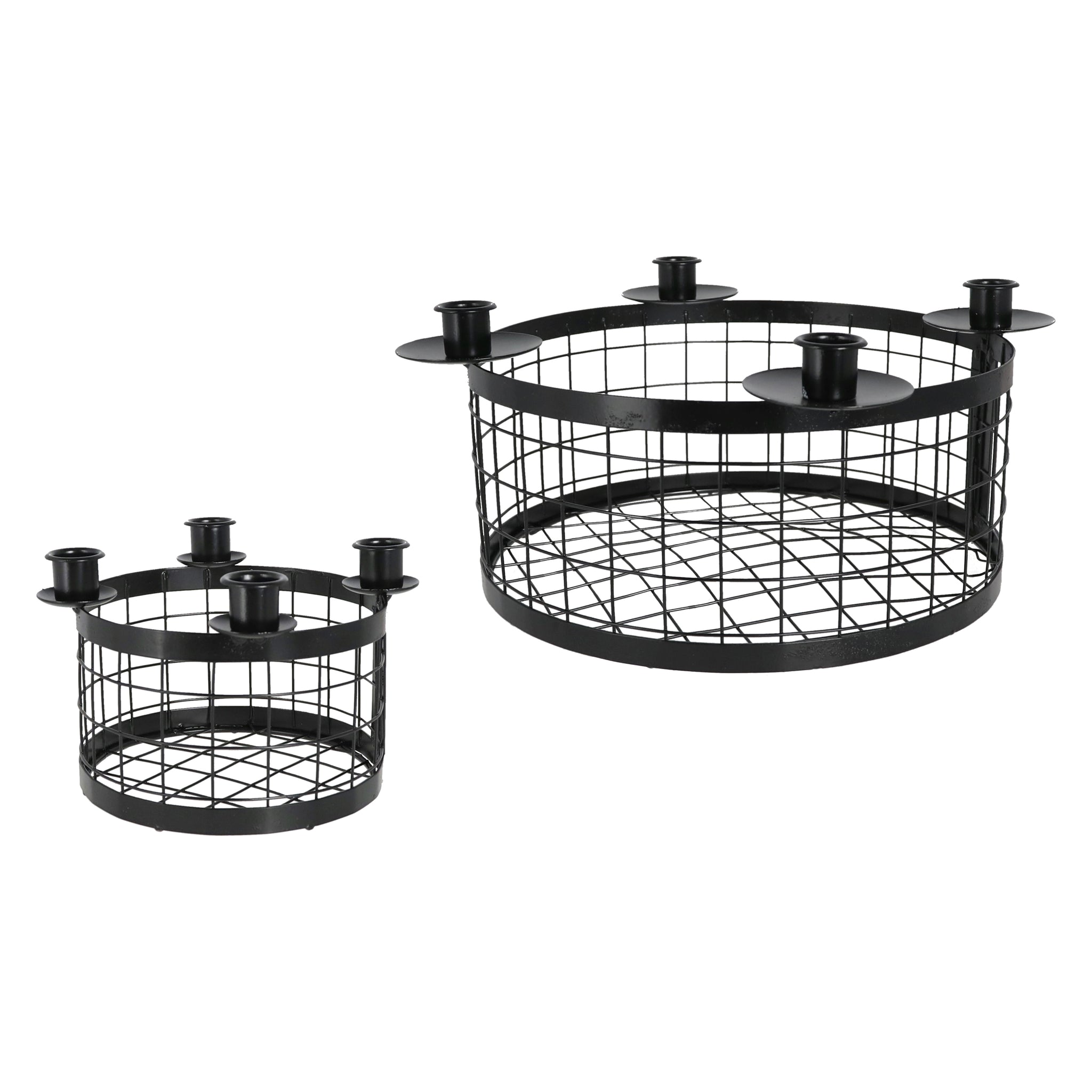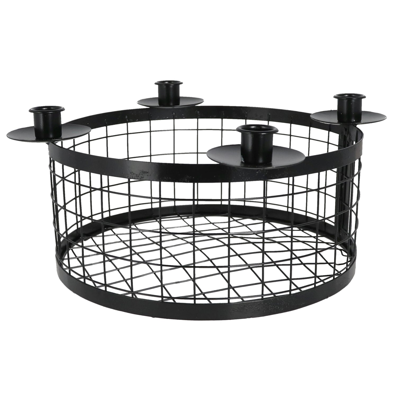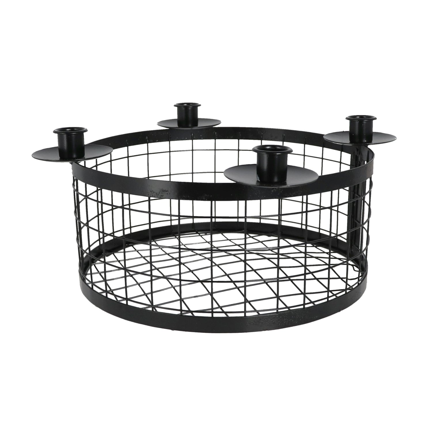 Er besteht aus einem runden Gitterkorb mit vier gleichmäßig angeordneten Kerzenhaltern und bietet Platz für Stabkerzen. Die schlichte, matte Oberfläche in Schwarz verleiht dem Kranz einen eleganten und gleichzeitig industriellen Charakter, der sich in moderne wie klassische Wohnstile einfügt.