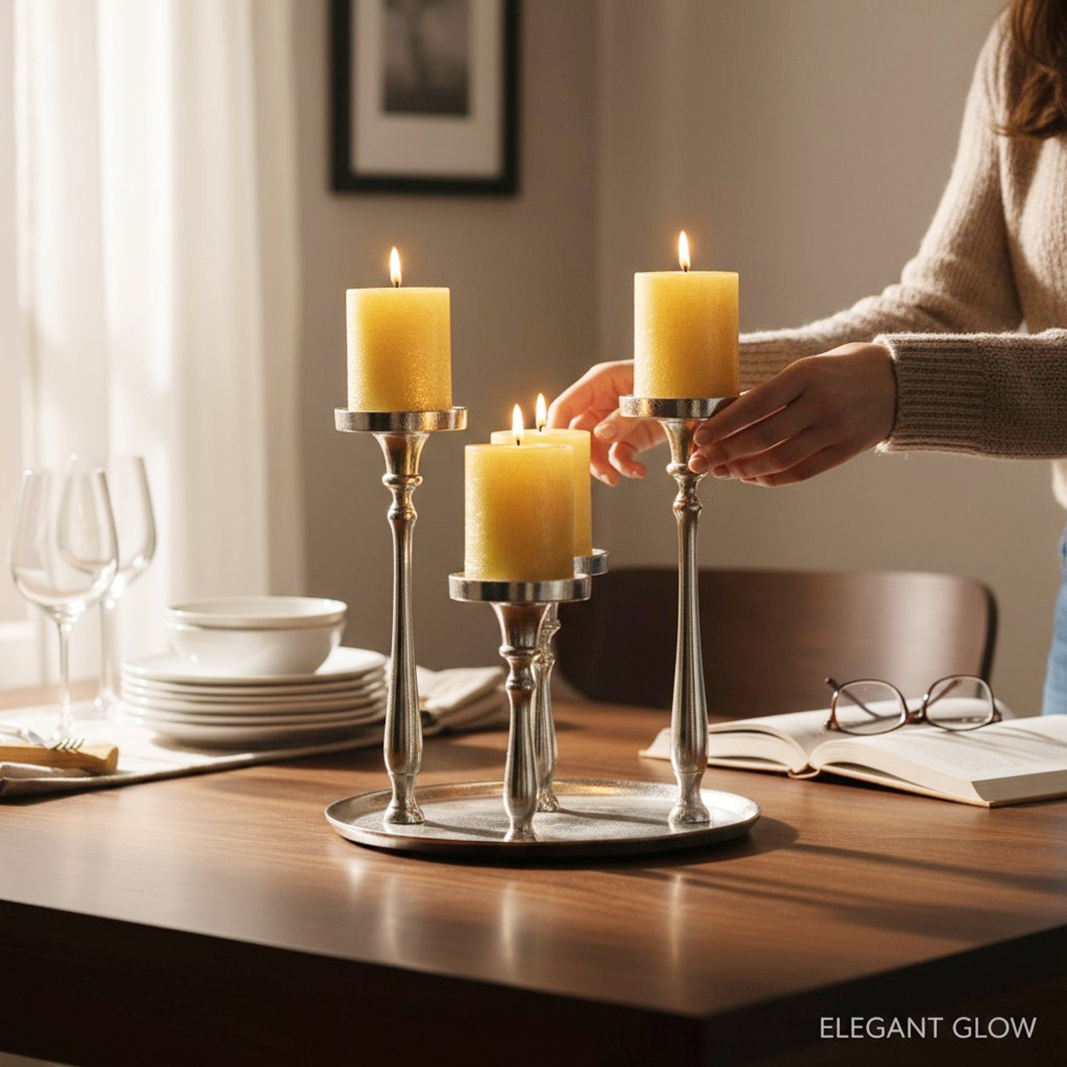Mit einem Durchmesser von 29 cm und einer Höhe von 27 cm bietet er Platz für vier Stumpenkerzen (nicht im Lieferumfang enthalten) und schafft ein stilvolles Zentrum auf jedem Tisch, Sideboard oder Kaminsims.