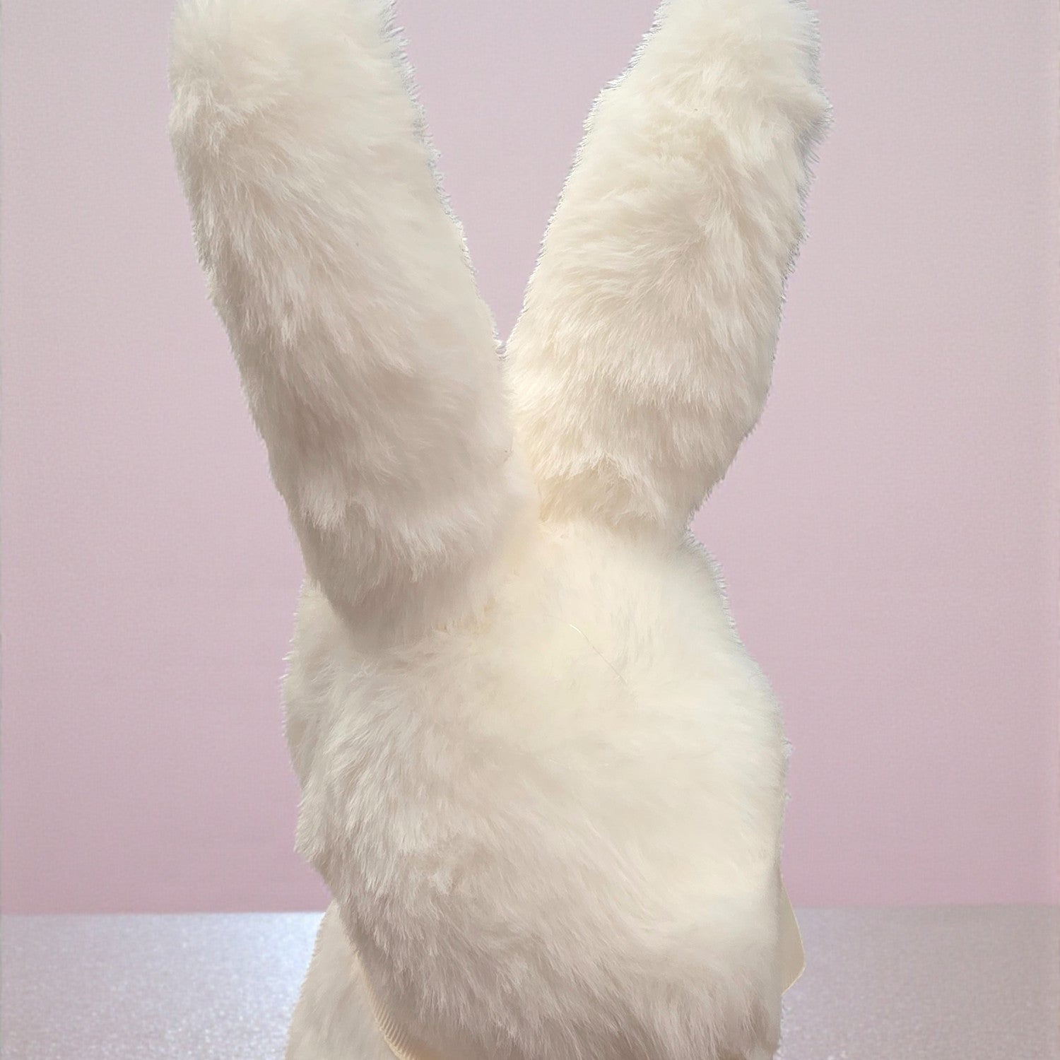 Gefertigt aus Polyester und Kunststoff, überzeugt die Figur durch ihre weiche, flauschige Felloberfläche und die sauber verarbeitete Schleife am Hals. Mit einer Höhe von 41 cm sowie einer Breite und Länge von jeweils 12 cm hat der Hase eine präsente, aber platzsparende Größe für Tisch, Sideboard, Fensterbank oder Regal.