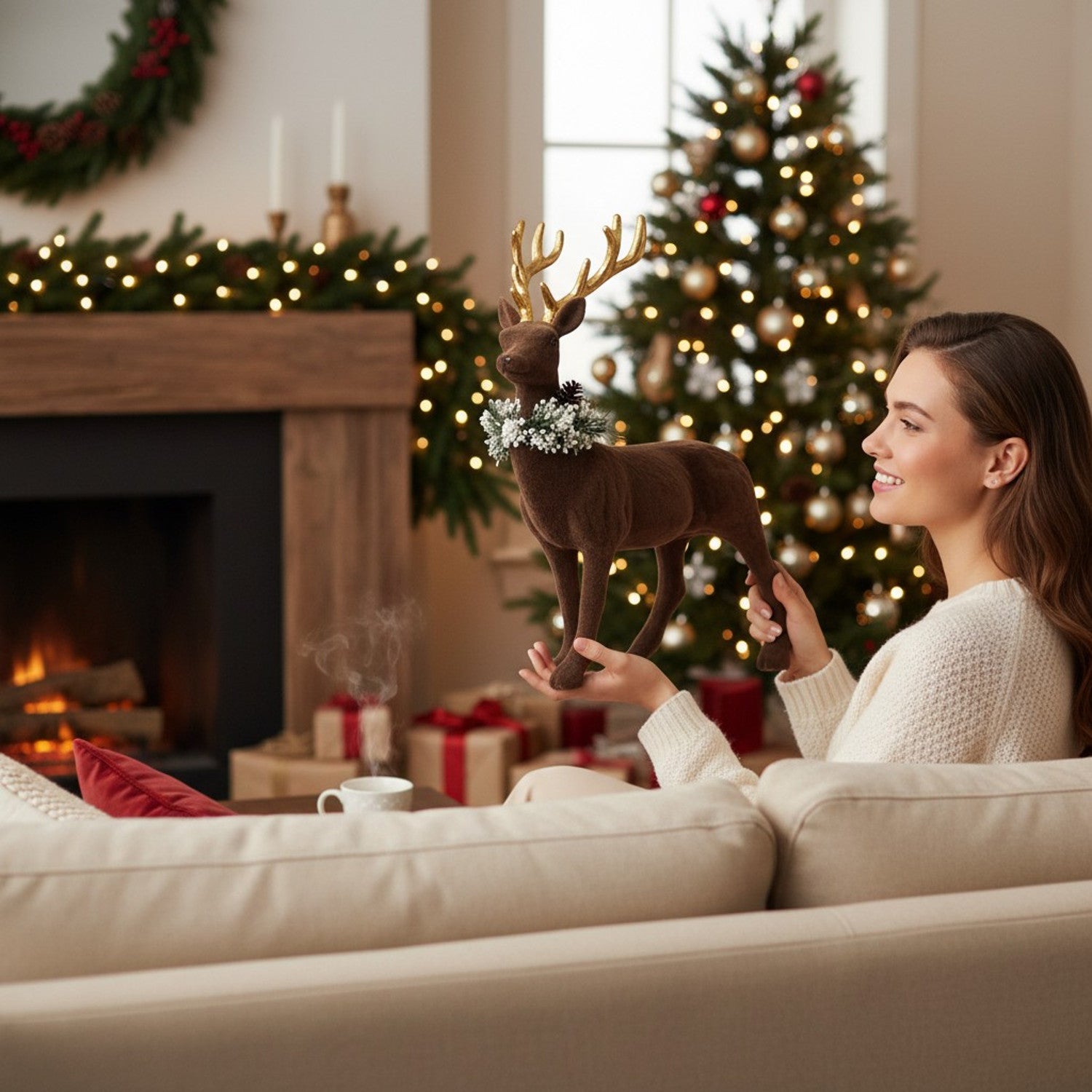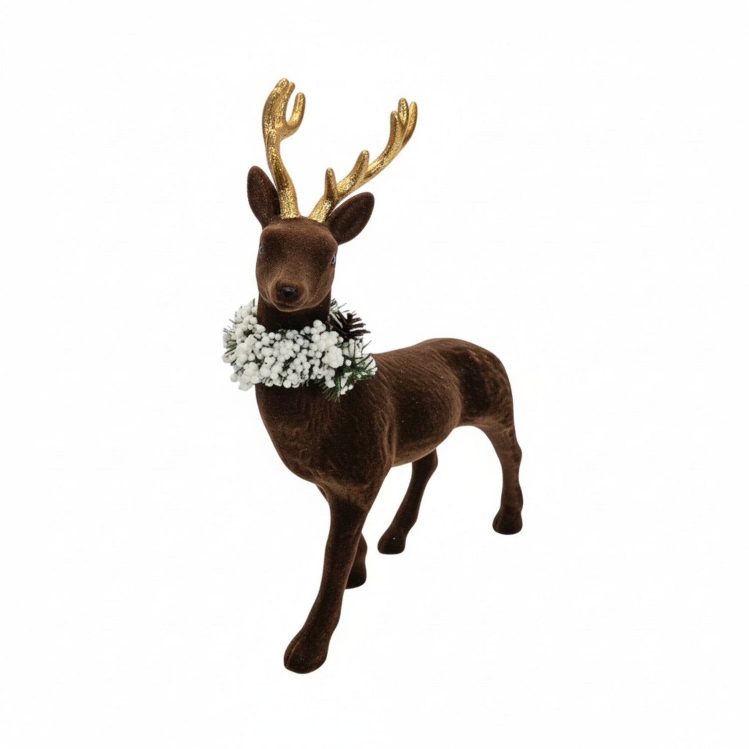 Sein fein modelliertes Geweih und die detailgetreue Form verleihen ihm eine elegante Ausstrahlung. Der dekorative Kranz aus weißen Beeren, Tannengrün und Zapfen sorgt für eine festliche Note.