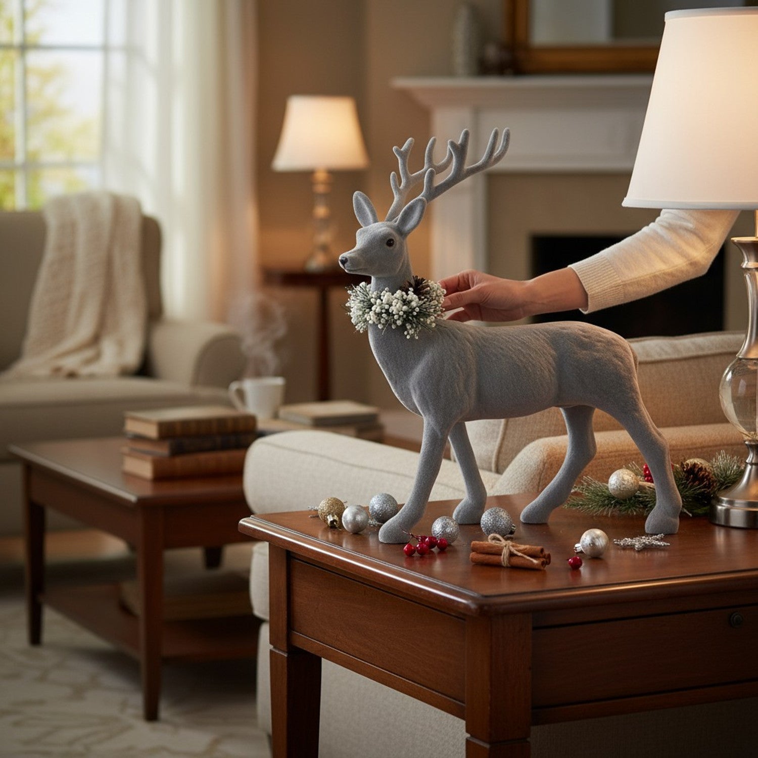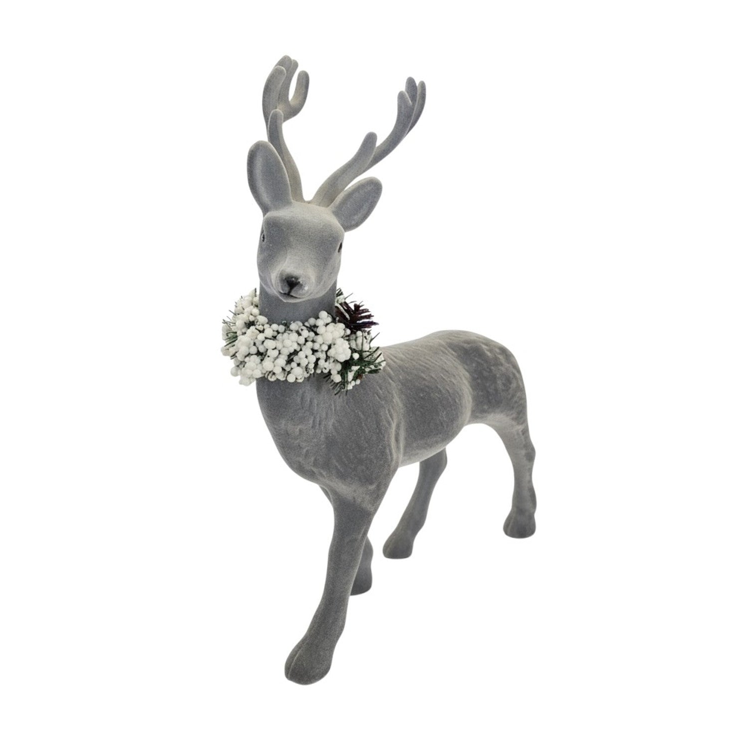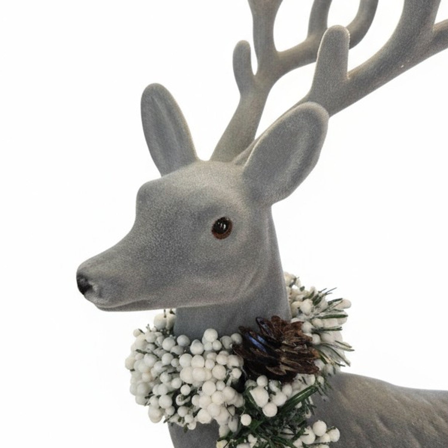 Sein fein modelliertes Geweih und die detailgetreue Form verleihen ihm eine elegante Ausstrahlung. Der dekorative Kranz aus weißen Beeren, Tannengrün und Zapfen sorgt für eine festliche Note.