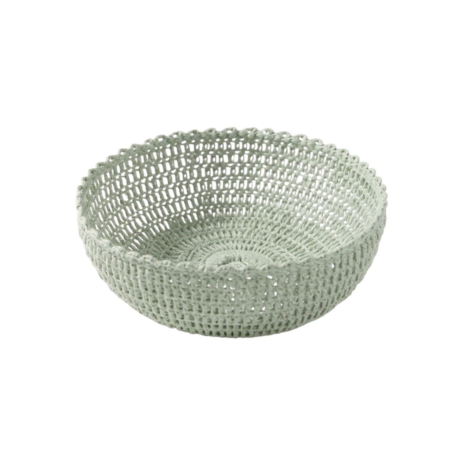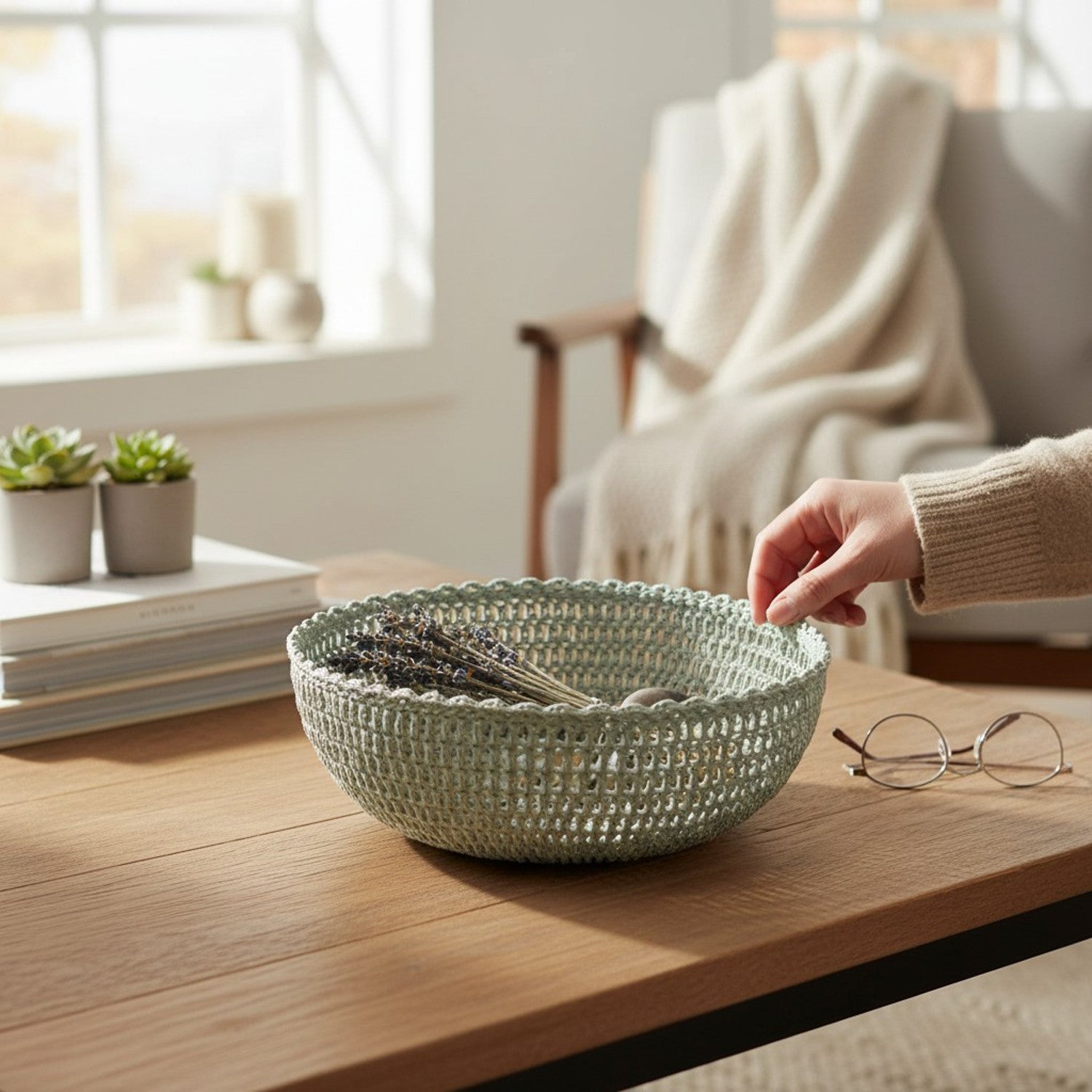 Diese Dekoschale aus Makramee überzeugt durch ihre klare Form, natürliche Materialien und eine ruhige grüne Farbgebung.