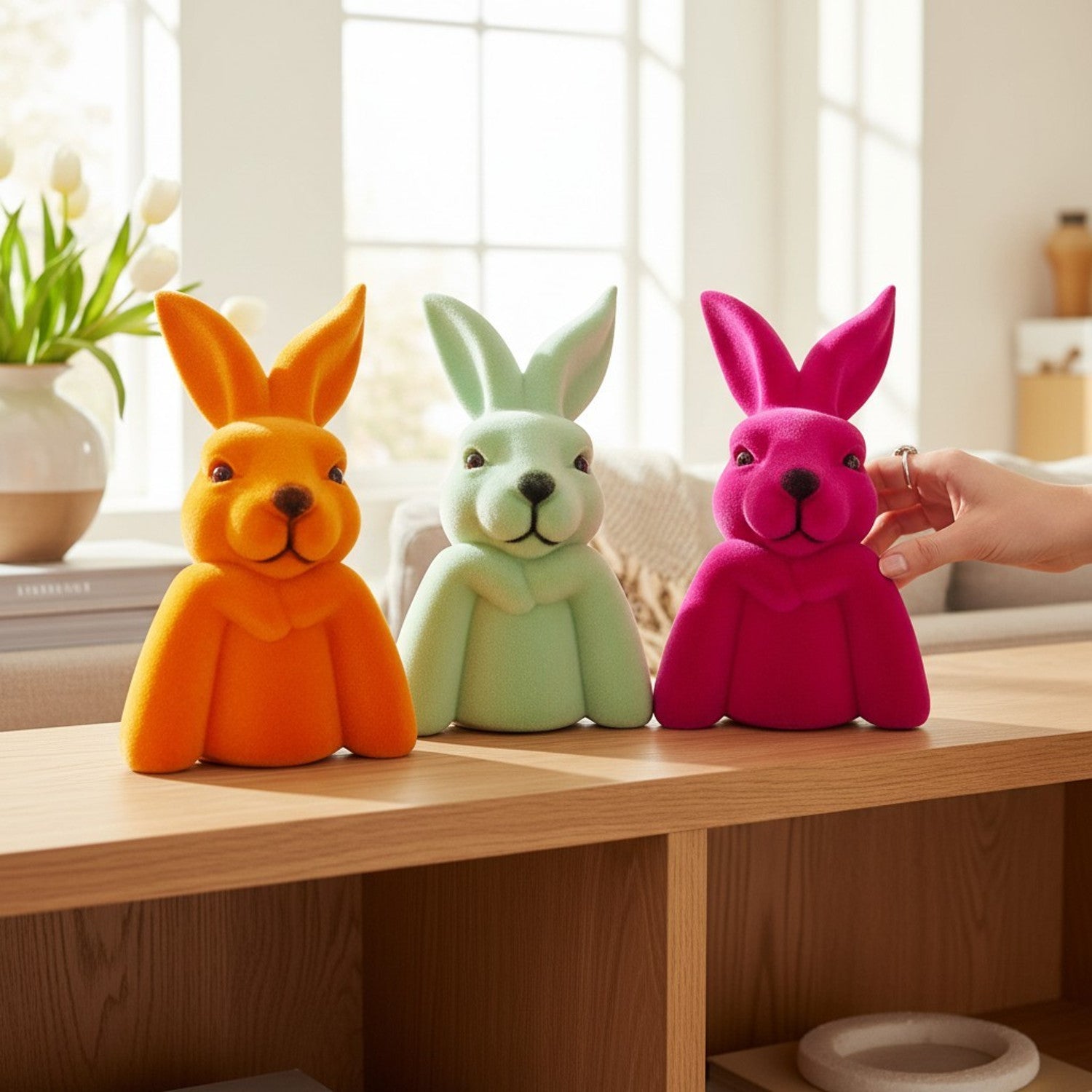 Die gleichmäßige Beflockung sorgt für eine weiche, matte Oberfläche ohne Glanz und verleiht der Figur eine hochwertige Anmutung. Das leichte, aber formstabile Material macht das Umstellen und Kombinieren mit weiterer Oster- und Frühlingsdeko besonders einfach. Ideal geeignet für Wohnräume, Flur, Büro, Schaufenster, Theke oder saisonale Präsentationen.