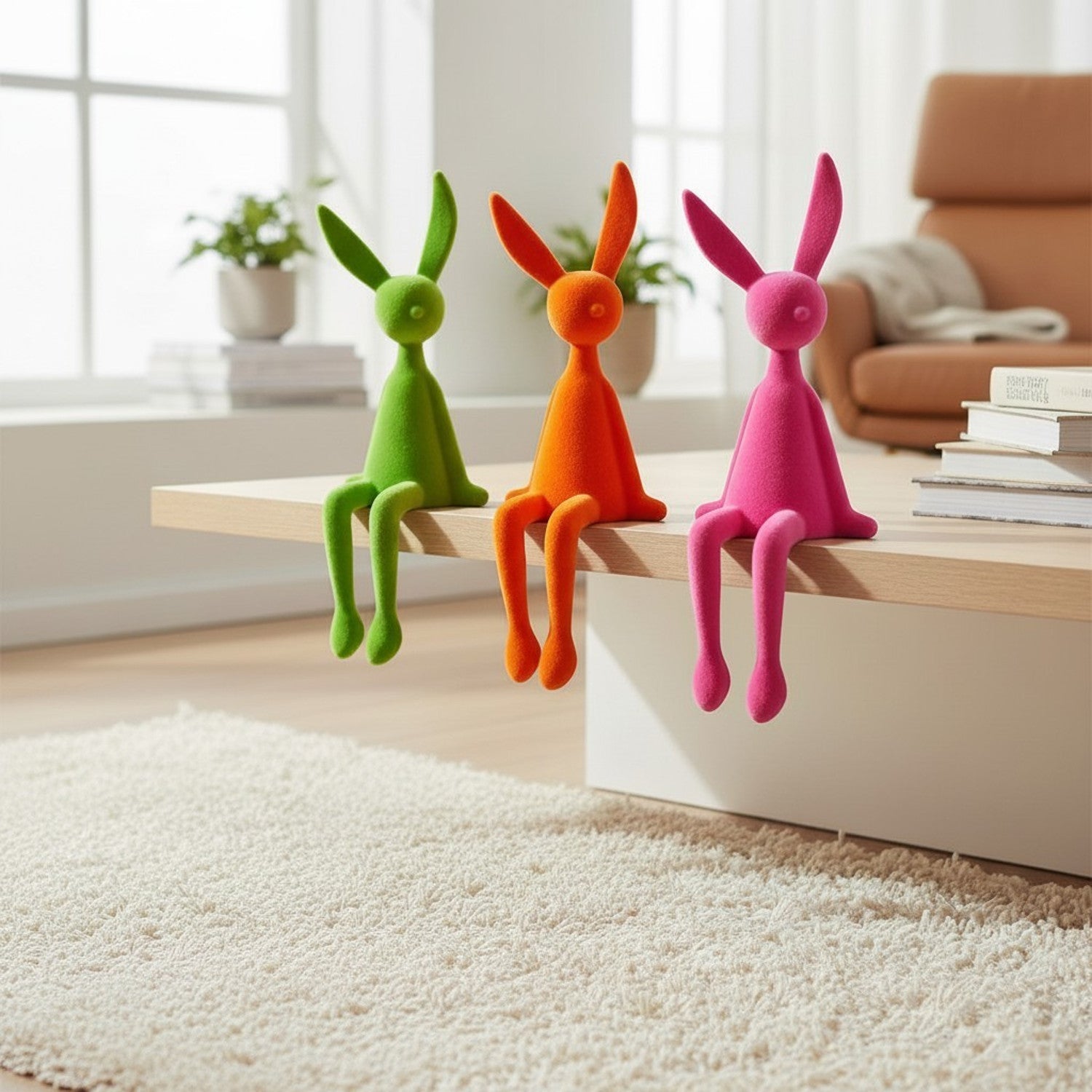 Dank der leichten, aber stabilen Kunststoffkonstruktion lässt sich der Hase einfach platzieren und flexibel umstellen. Er eignet sich für Wohnzimmer, Flur, Küche, Kinderzimmer, Schaufenster, Verkaufsflächen oder saisonale Dekotische. Die beflockte Oberfläche verleiht dem Hasen eine hochwertige Optik und hebt ihn klar von glatten Kunststofffiguren ab.