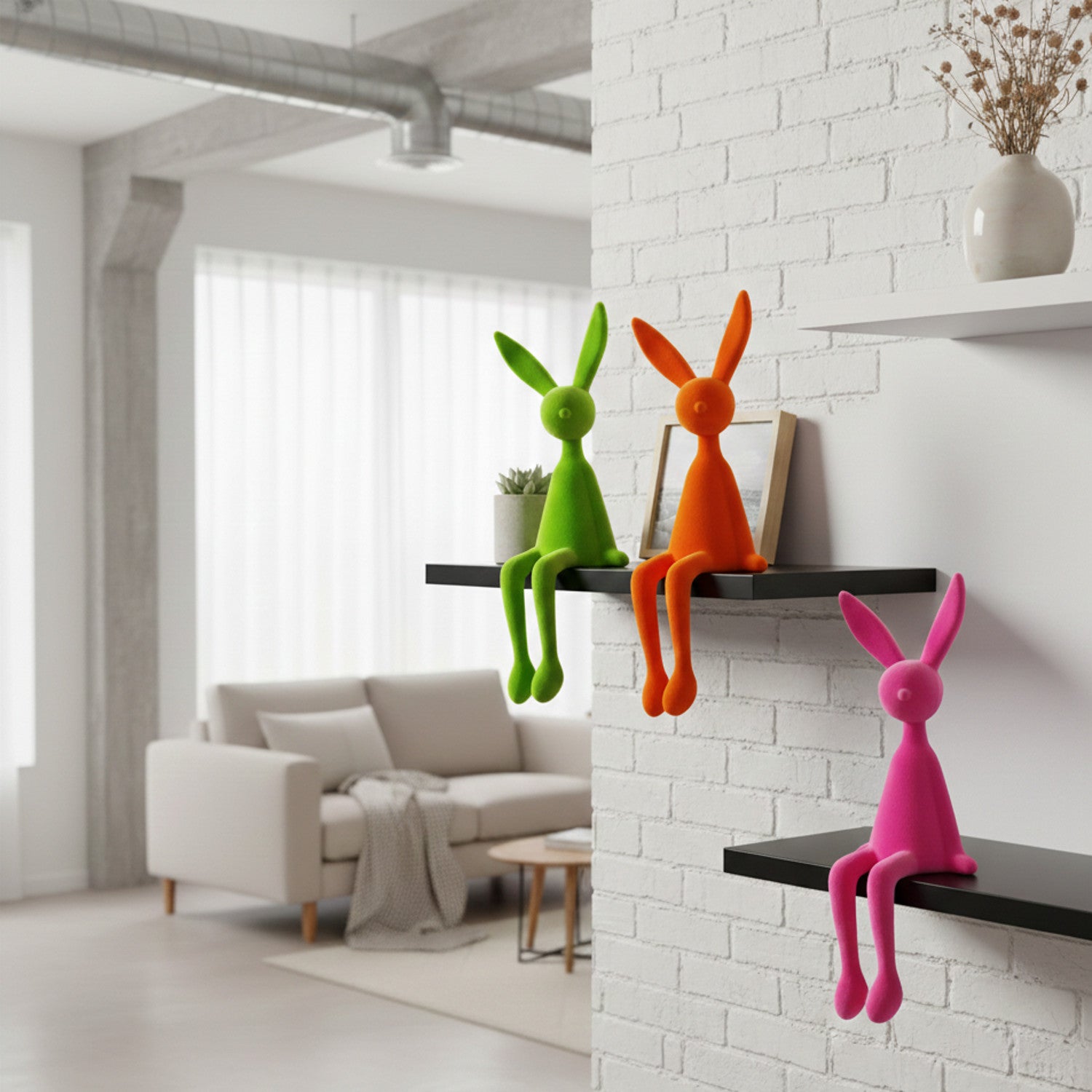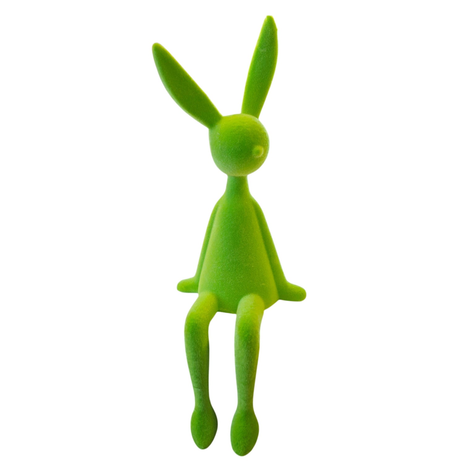 Die Figur besteht aus robustem Kunststoff und ist vollständig beflockt, wodurch sie eine matte, samtige Oberfläche mit angenehmer Haptik erhält. Der Hase sitzt mit baumelnden Beinen auf Kanten und Absätzen und wirkt dadurch besonders lebendig und dekorativ.