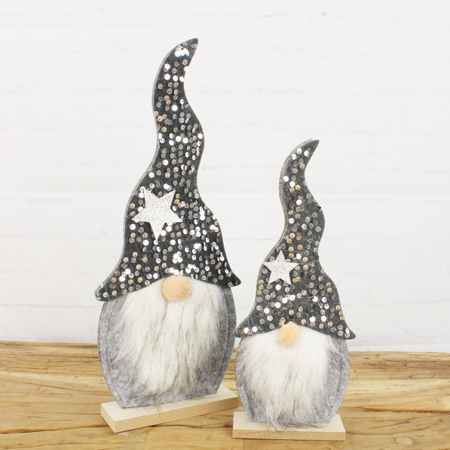 Jeder Dekowichtel steht sicher auf einem stabilen Holzsockel, was für festen Halt sorgt, egal ob Sie sie auf einem Regal, dem Kamin oder als Tischdeko platzieren. Die zwei unterschiedlichen Größen – der kleinere misst 12 x 4 x 29 cm, der größere 16 x 4 x 39 cm – sorgen für eine harmonische und verspielte Optik.