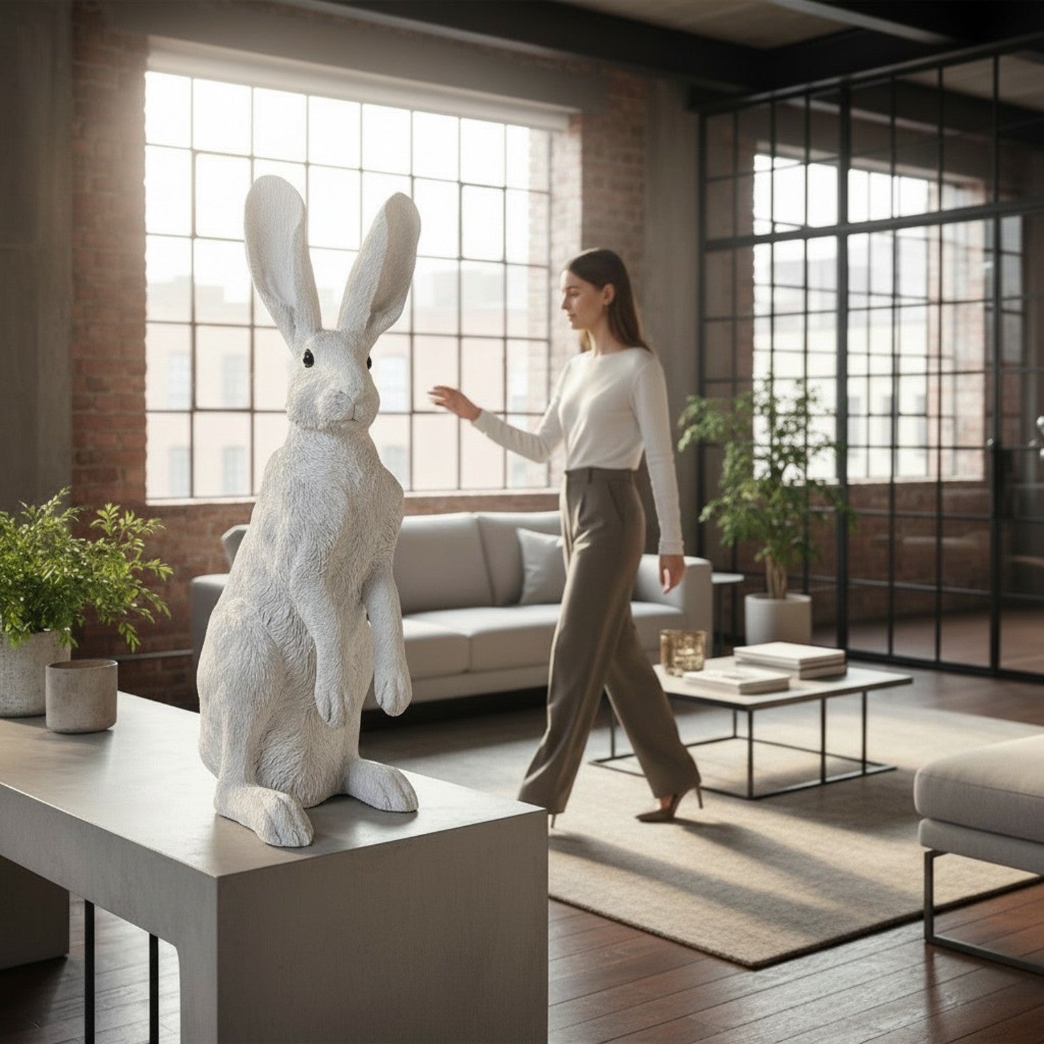 Mit seiner imposanten Höhe von 52 cm wird er sofort zum Blickfang in jedem Raum. Die Figur besteht aus stabilem Polyresin und überzeugt durch eine fein ausgearbeitete, realistische Fellstruktur, die dem Hasen eine besonders hochwertige Optik verleiht.
